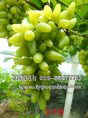 【金手指葡萄】,歐美雜交種。由日本葡萄育種家田一于1982年雜交育成。果穗長圓錐形,果粒著生中等緊密或偏緊,平均穗重500克。果粒長橢圓形,略彎曲,呈弓形,平均粒重8.5克,重大粒重可達13克。果皮薄,黃綠色,果粉厚。果肉軟硬適中,味甜爽口,無酸味,稍有玫瑰香味,可溶性固形物含量約為20%,品質優良。每個果粒含種子1~3粒,種子與果肉易分離。3月下旬萌芽,5月上中旬開花,8月上旬漿果成熟。生長勢中庸,始果期早。適于各種架式和樹形,以中梢修剪為主,抗病性與巨峰大致相當。