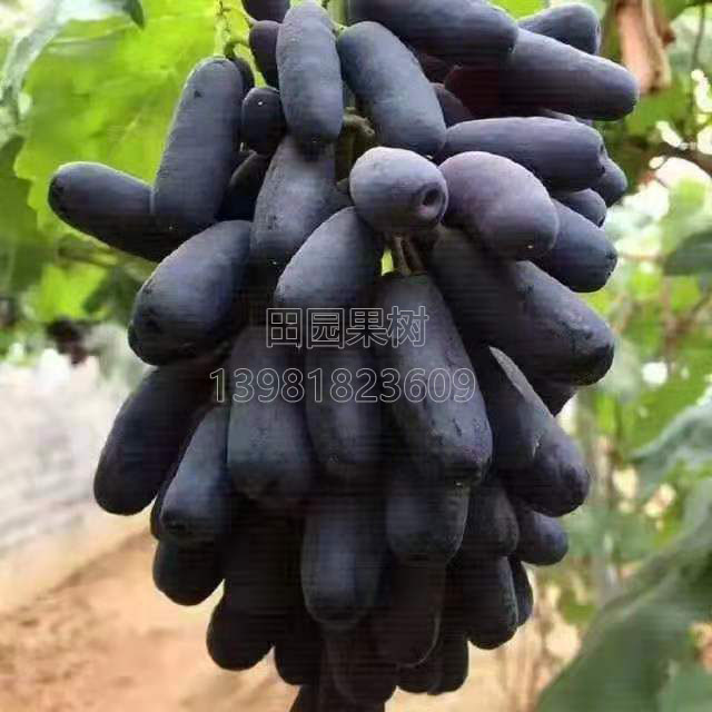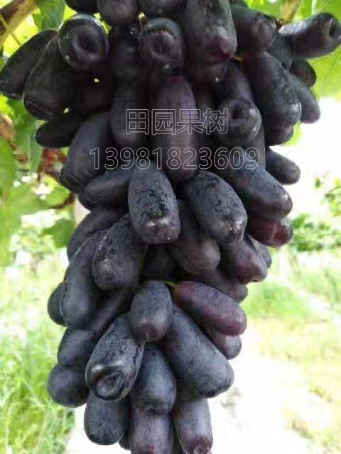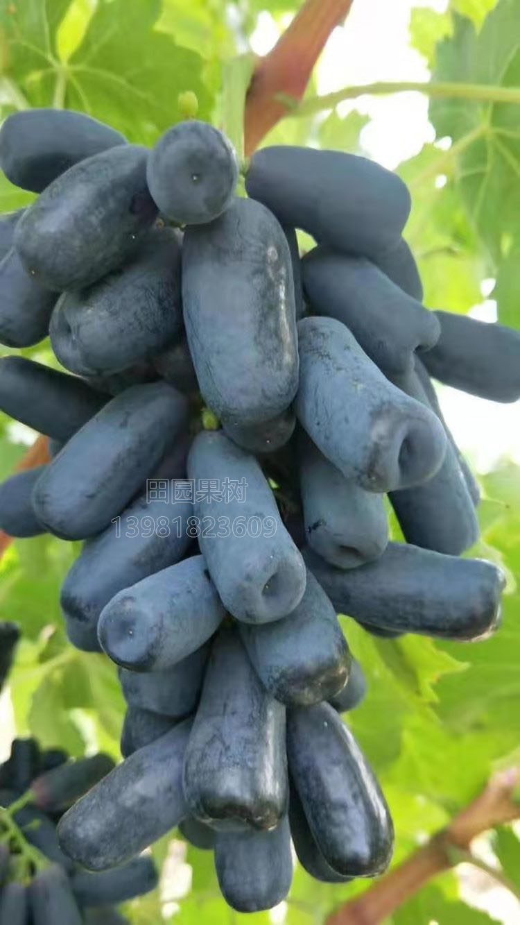 藍寶石為中熟品種,露地8~9月成熟,成熟后不落粒、不爛尖,掛樹1個月以上,耐貯運。易形成1000克以上的大穗,自然無籽,果粒不用激素膨大也能達到10克左右。果粒長圓柱形,狀如小手指,長5cm左右。果色藍黑,著色快速而均勻。刀切成片,風味純正,脆甜無渣,可溶性固形物20%以上,干燥少雨地區糖度更高,容易曬成藍黑色大型葡萄干。果粒不擁擠,無破粒,疏果省工。果刷堅韌,成熟后不易掉粒。并且采用小龍干技術,產量倍增,在我國南北方已開始種植三年,是一個高檔的鮮食葡萄新品種。